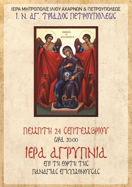 Ιερά αγρυπνία θα τελεσθεί στην ενορία της Αγίας Τριάδας Πετρουπόλεως, Τρίτη 24 Σεπτεμβρίου 2020 και ώρα 20:00, επί τη εορτή της Παναγίας Εγκυμονούσας.