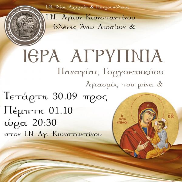 Ιερά αγρυπνία θα τελεστεί στον Ιερό Ναό Αγίων Κωνσταντίνου και Ελένης Άνω Λιοσίων επί τη εορτή της Παναγίας της Γοργοεπηκόου.