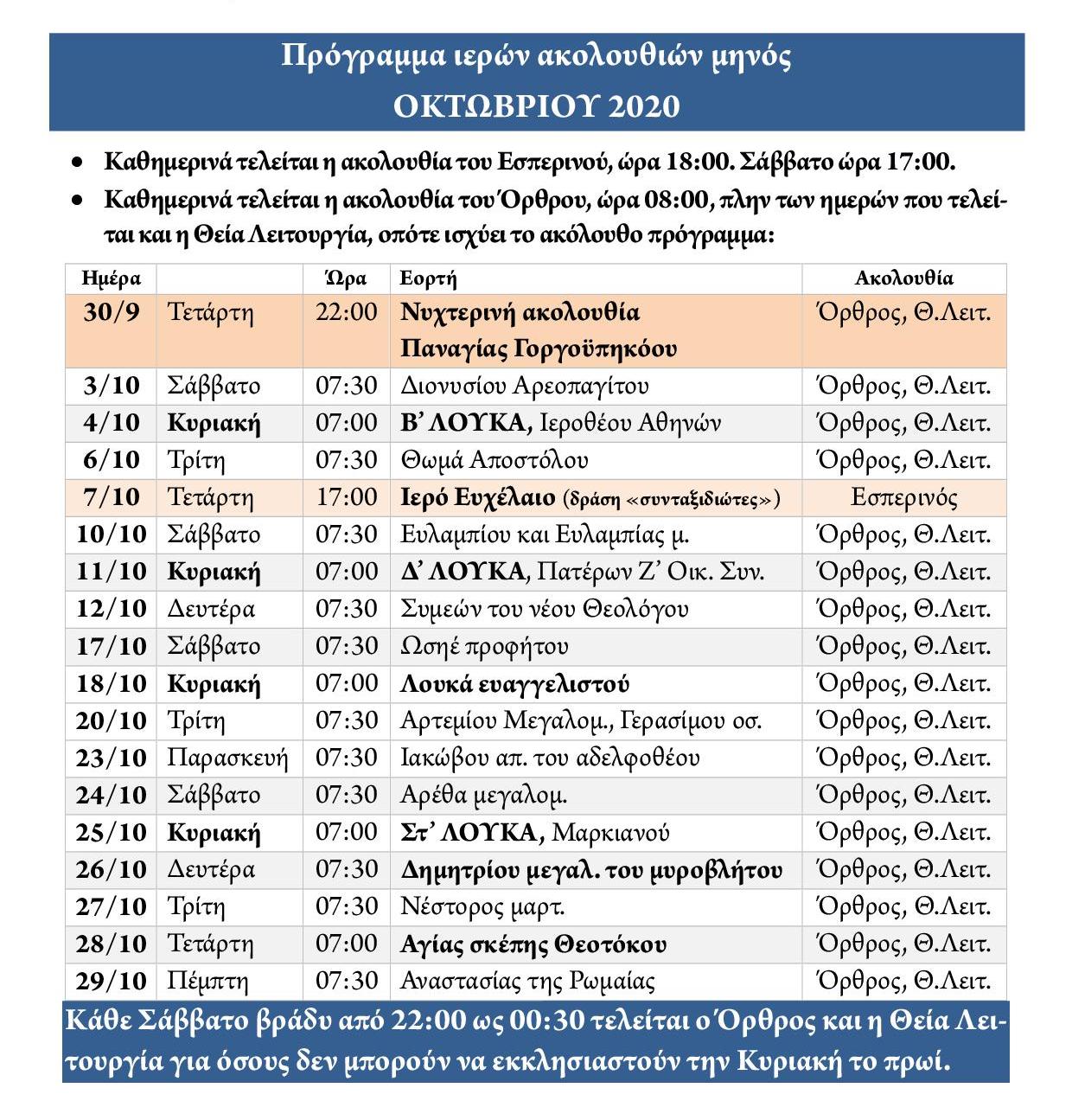 Πρόγραμμα ακολουθιών Οκτωβρίου 2020