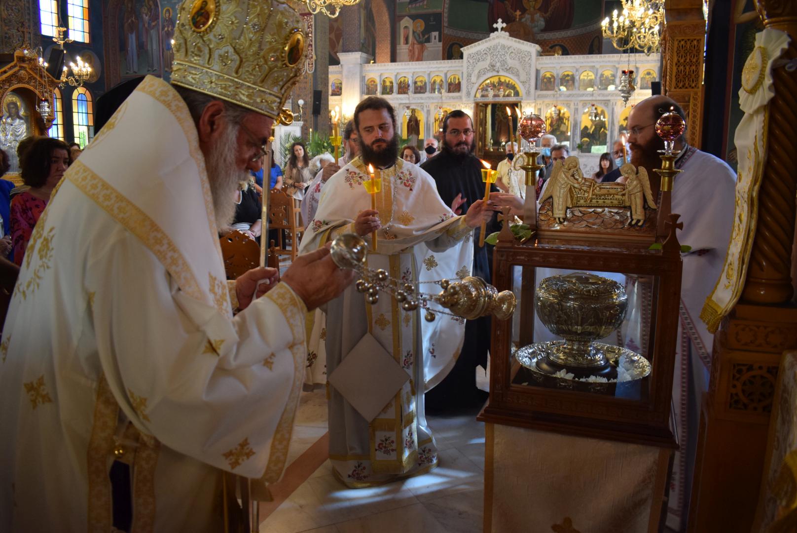 Μετά την οπισθάμβωνο ευχή της Θείας Λειτουργίας, ο κ. Αθηναγόρας εγκατέστησε σε μόνιμη προθήκη τεμάχιο λειψάνου της Αγίας Βαρβάρας, το οποίο θησαυρίζεται εδώ και πολλές δεκαετίες στον Ιερό Ναό. Με απόφαση του Εκκλησιαστικού Συμβουλίου του Ιερού Ναού, το λείψανο θα βρίσκεται εκεί πάντοτε προς προσκύνηση από τους πιστούς, δίπλα στην παλαιά εικόνα της Αγίας.