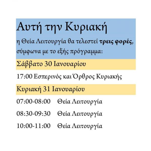 Κυριακή 31 Ιανουαρίου 07:00-08:00 Θεία Λειτουργία 08:30-09:30 Θεία Λειτουργία 10:00-11:00 Θεία Λειτουργία