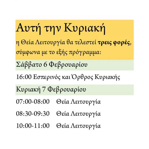 Αυτή την Κυριακή 7/2 η Θεία Λειτουργία στην ενορία Αγίας Βαρβάρας Ιλίου θα τελεστεί τρεις φορές, σύμφωνα με το εξής πρόγραμμα: