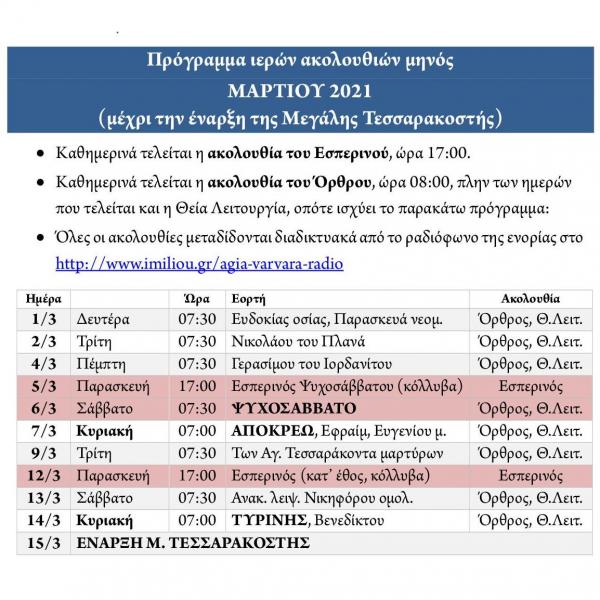 Πρόγραμμα ακολουθιών Μαρτίου 2021