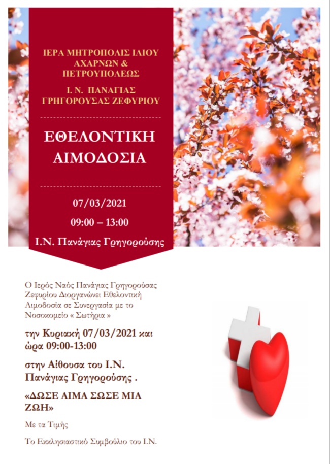 Ο Ιερός Ναός Παναγίας Γρηγορούσας Ζεφυρίου διοργανώνει εθελοντική αιμοδοσία σε συνεργασία με το Νοσοκομείο «Σωτηρία», την Κυριακή 7/3/2021, από 09:00-13:00, στην αίθουσα του Ιερού Ναού.