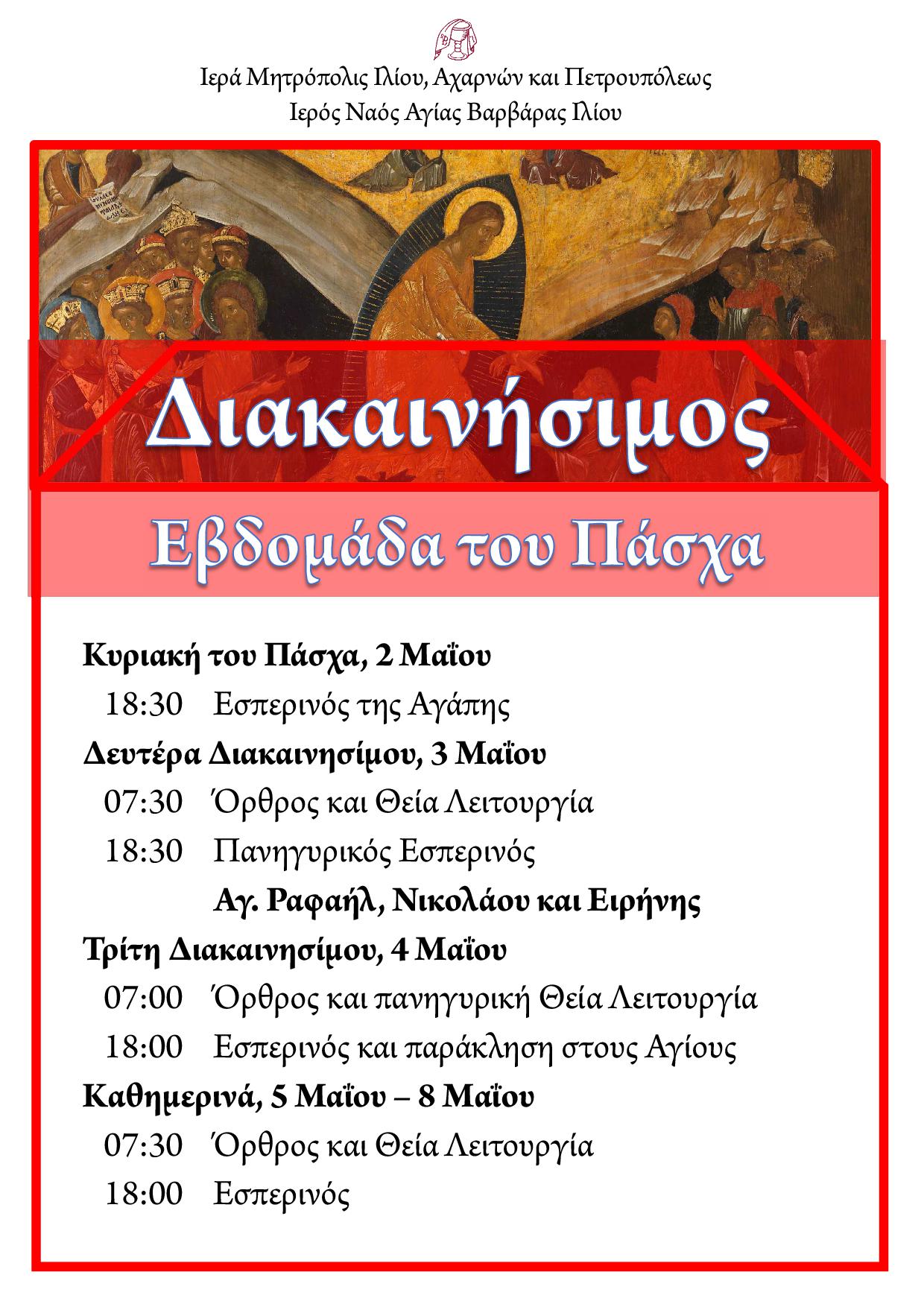 Δείτε το πρόγραμμα ακολουθιών της Διακαινησίμου Εβδομάδας στον Ιερό Ναό Αγίας Βαρβάρας Ιλίου.
