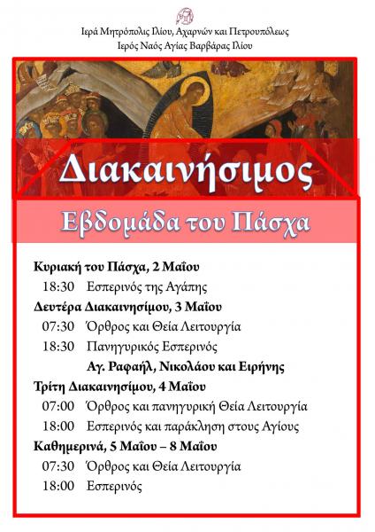 Πρόγραμμα ακολουθιών Διακαινησίμου Εβδομάδας