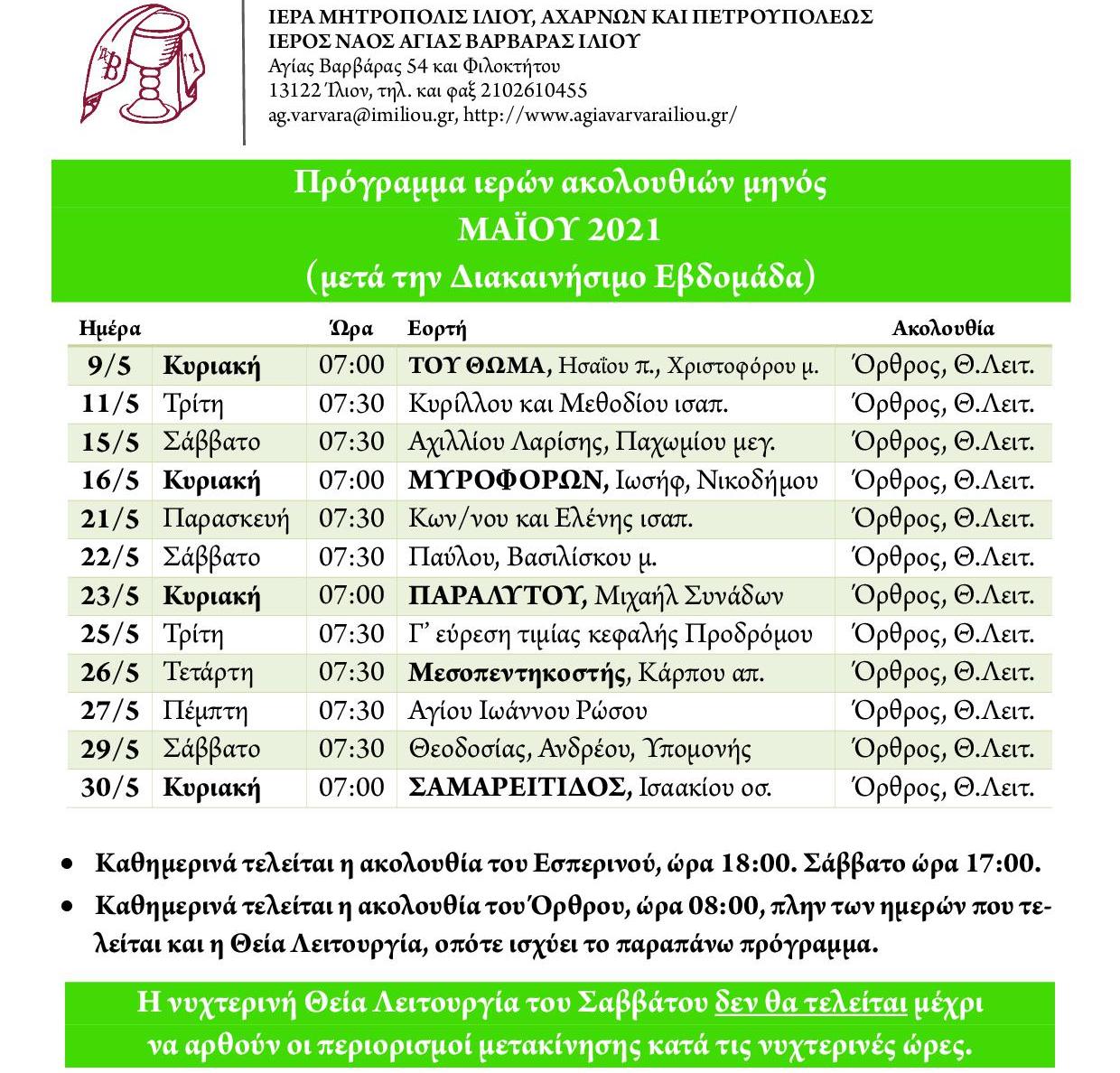 Δείτε το πρόγραμμα των ακολουθιών της ενορίας Αγ. Βαρβάρας Ιλίου για το μήνα Μάιο 2021, μετά την Διακαινήσιμο Εβδομάδα.