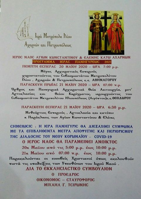 Την Πέμπτη και την Παρασκευή 20 και 21 Μαΐου 2021 θα τελεστεί η Ιερά Πανήγυρις του Ι.Ν. Αγίων Κωνσταντίνου και Ελένης Κάτω Αχαρνών.