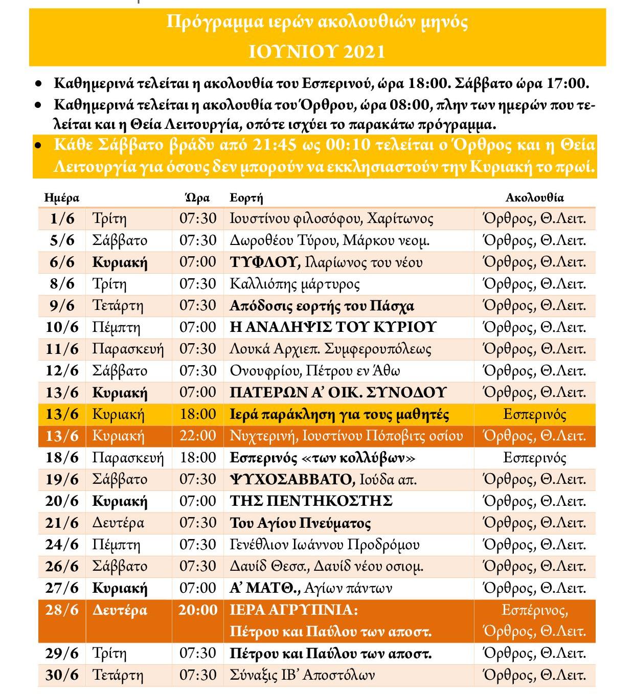 Πρόγραμμα ακολουθιών Ιουνίου 2021