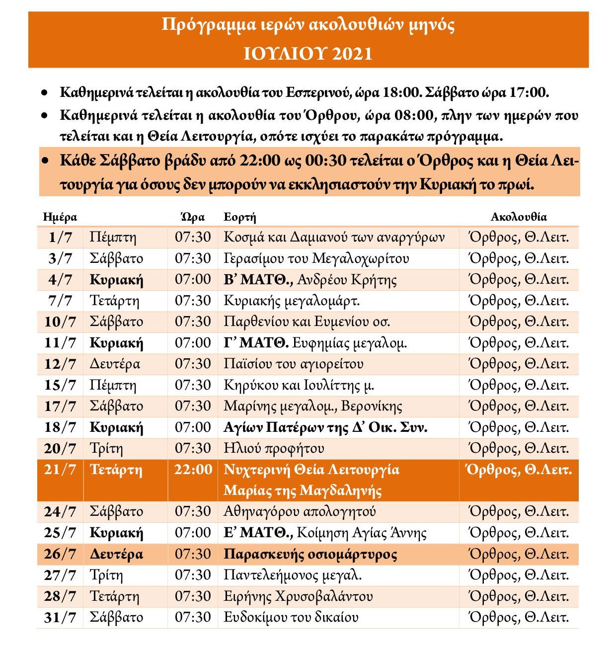 Πρόγραμμα ακολουθιών Ιουλίου 2021