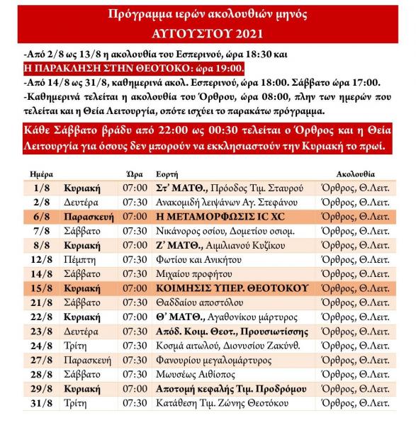 - Από 1/8 ως 13/8 η ακολουθία του Εσπερινού, ώρα 18:30 και η Παράκληση στην Θεοτόκο ώρα 19:00.
