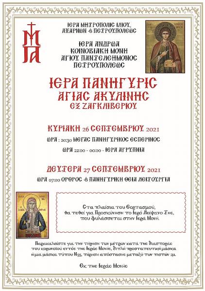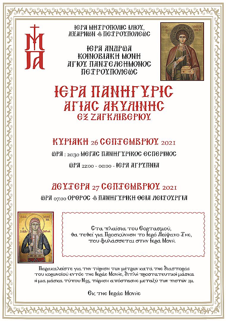 Την Κυριακή 26 και τη Δευτέρα 27 Σεπτεμβρίου 2021 θα τελεστεί η πανήγυρις της Αγίας Ακυλίνης εκ Ζαγκλιβερίου, στην Ιερά Μονή Αγίου Παντελεήμονος Πετρουπόλεως.