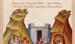 Ιερά αγρυπνία επί τη εορτή της αναστάσεως του Λαζάρου θα τελεστεί στον Ιερό Καθεδρικό Ναό Αγίου Δημητρίου Πετρουπόλεως, την Παρασκευή 3 Απριλίου 2026, στις 21:00.
