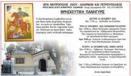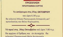 Το Εκκλησιαστικό Συμβούλιο του Ιερού Ναού Αγίου Δημητρίου Αχαρνών έχει την τιμή να σας προσκαλέσει να τιμήσετε με την παρουσία σας την πανήγυρη της ενορίας, που θα τελεστεί σύμφωνα με το ακόλουθο πρόγραμμα: