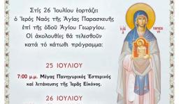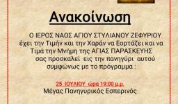 Η ενορία του Αγίου Στυλιανού Ζεφυρίου έχει την τιμή και τη χαρά να εορτάζει και να τιμά τη μνήμη της Αγίας Παρασκευής και σας προσκαλεί στην πανήυρη, σύμφωνα με το ακόλουθο πρόγραμμα: