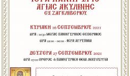 Την Κυριακή 26 και τη Δευτέρα 27 Σεπτεμβρίου 2021 θα τελεστεί η πανήγυρις της Αγίας Ακυλίνης εκ Ζαγκλιβερίου, στην Ιερά Μονή Αγίου Παντελεήμονος Πετρουπόλεως.