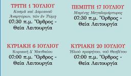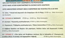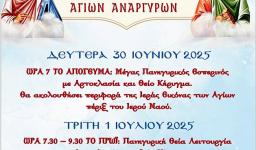 Κατά το διήμερο 30ής Ιουνίου και 1ης Ιουλίου 2025 πανηγυρίζει το Ιερό Παρεκκλήσιο των Αγίων Αναργύρων Κοσμά και Δαμιανού στον κήπο του Ιερού Ναού Αγίου Γεωργίου Ζωφριάς σύμφωνα με το πρόγραμμα: