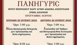 Το Εκκλησιαστικό Συμβούλιο του Ι.Ν. Αγ. Τρύφωνος Καματερού έχει την τιμή και την χαρά να σας προσκαλέσει στις λατρευτικές εκδηλώσεις που θα διεξαχθούν επ' ευκαιρία της εορτής της μνήμης του Αγίου Μεγαλομάρτυρος Μεδίκου του αναργύρου ιατρού, την 25η και 26η Ιουνίου κατά το παρακάτω πρόγραμμα: