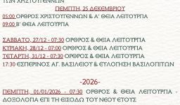 Νυχτερινή Χριστουγεννιάτικη Θεία Λειτουργία με Όρθρο θα τελεστεί στον Ιερό Ναό Αγίας Βαρβάρας Ιλίου, την Τετάρτη 24 Δεκεμβρίου 2025, από 22:00 έως 01:00 περίπου.