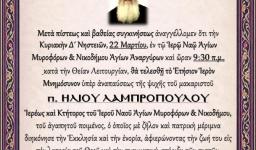 Μετά πίστεως και βαθείας συγκινήσεως αναγγέλομεν ότι την Κυριακήν Δ' Νηστειών, 22 Μαρτίου 2026, εν τω Ιερώ Ναώ Αγίων Μυροφόρων και Νικοδήμου Αγίων Αναργύρων και ώρα 09:30 (κατά την Θείαν Λειτουργίαν) θα τελεσθή το ετήσιον ιερόν μνημόσυνον υπέρ αναπαύσεως της ψυχής του μακαριστού π. Ηλιού Λαμπροπούλου, ιερέως και κτήτορος του Ιερού Ναού.