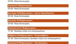 Την Τετάρτη 12.01.2025 θα τελεστεί στον Ιερό Ναό της Ζωοδόχου Πηγής Ιλίου βραδινή Θεία Λειτουργία επί τη μνήμη των Αγίων Αποστόλων Ακύλα και Πρισκίλλης, του Οσίου Μαρτινιανού και του εν Αγίοις πατρός ημών Ευλογίου Αλεξανδρείας.