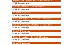 Πέμπτη 21 Νοεμβρίου, ώρα 07:00, Όρθρος - Πανηγυρική Θεία Λειτουργία, επί τη εορτή Εισοδίων Θεοτόκου. 18:00 Μεθέορτος Εσπερινός - Ιερά Παράκλησις. Ώρα 20:00, Ιερά αγρυπνία επί τιμή και μνήμη του Οσίου Ιακώβου του Τσαλίκη.