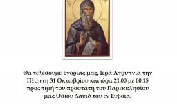 Ιερά αγρυπνία θα τελεστεί στον Ιερό Ναό Αγίου Διονυσίου Ιλίου επί τη μνήμη του Οσίου Δαυίδ του εν Ευβοία, στον οποίο τιμάται το παρεκκλήσιο του Ιερού Ναού, την Πέμπτη 31 Οκτωβρίου 2024, από 21:00 έως 00:15 περίπου.