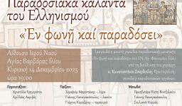 Μουσική εκδήλωση με παραδοσιακά κάλαντα του ελληνισμού θα πραγματοποιηθεί στην αίθουσα του Ιερού Ναού Αγίας Βαρβάρας Ιλίου, την Κυριακή 14 Δεκεμβρίου 2025. Τραγουδά η μεικτή χορωδία παραδοσιακής μουσικής του Ι.Ν. Αγίου Φανουρίου Ιλίου, υπό την διεύθυνση του χοράρχη κ. Κωνσταντίνου Σπερδούλη, Πρωτοψάλτη, συνοδεία παραδοσιακών οργάνων.