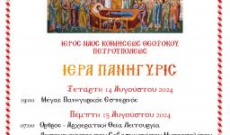 Στις 15 Αυγούστου 2024 ο Σεβασμιώτατος Μητροπολίτης Ιλίου, Αχαρνών και Πετρουπόλεως κ. Αθηναγόρας τέλεσε την Θεία Λειτουργία της εορτής της Κοιμήσεως της Θεοτόκου στο ομώνυμο Ιερό Ναό στην Πετρούπολη, με συλλειτουργούς τους Αρχιμ. Νικόδημο Αθανασίου, Πρωτοσύγκελλο της Ιεράς Μητροπόλεως και Β΄ Γραμματέα της Ιεράς Συνόδου, Αρχιμ. Παντελεήμονα Ηλιάκη, Πρωτ. Κωνσταντίνο Κασσό, Αρχιερατικό Επίτροπο Πετρουπόλεως, Πρωτ. Γεώργιο Αγγελόπουλο και τον διάκονο του π. Άγγελο Μιχαλόπουλο.