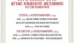 Την Τετάρτη 04.10.2023, θα τελεστεί στον Ιερό Ναό της Ζωοδόχου Πηγής Ιλίου απογευματινή Θεία Λειτουργία επί τη μνήμη της Αγίας Μάρτυρος Χαριτίνης, της Οσίας Μεθοδίας της εν Κιμώλω και του Αγίου ιερομάρτυρος Ερμογένους του Κυπρίου.