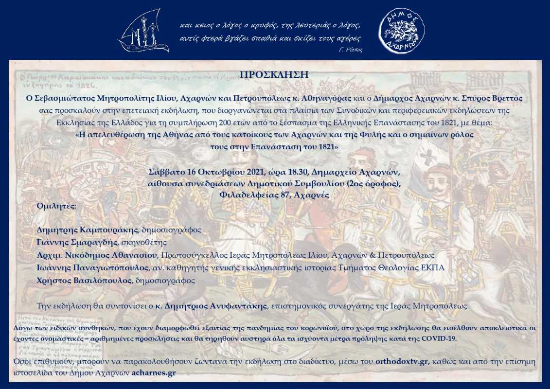 Ο Σεβασμιώτατος Μητροπολίτης Ιλίου, Αχαρνών και Πετρουπόλεως κ. Αθηναγόρας και ο Δήμαρχος Αχαρνών κ. Σπύρος Βρεττός σας προσκαλούν στην επετειακή εκδήλωση, που διοργανώνεται στα πλαίσια των Συνοδικών και περιφερειακών εκδηλώσεων της Εκκλησίας της Ελλάδος για τη συμπλήρωση των 200 ετών από το ξέσπασμα της Ελληνικής Επανάστασης του 1821, με θέμα: