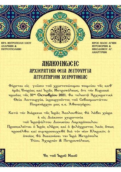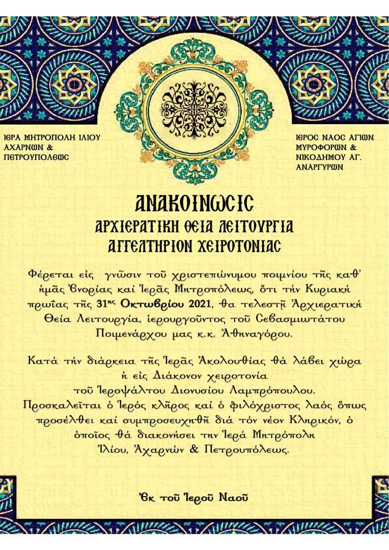 Φέρεται εις γνώσιν του χριστεπωνύμου ποιμνίου της καθ' ημάς ενορίας και Ιεράς Μητροπόλεως, ότι την Κυριακή 31 Οκτωβρίου 2021 θα τελεστεί Αρχιερατική Θεία Λειτουργία, ιερουργούντος του Σεβασμιωτάτου Μητροπολίτου Ιλίου κ. Αθηναγόρου, στον Ι.Ν. Αγίων Μυροφόρων και Νικοδήμου.