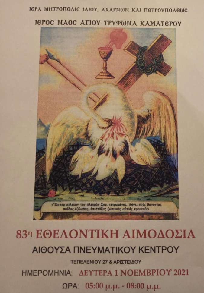 Τη Δευτέρα 1 Νοεμβρίου 2021, από 5 μ.μ. ως 8 μ.μ., θα πραγματοποιηθεί η 83η εθελοντική αιμοδοσία της ενορίας Αγίου Τρύφωνος Καματερού, στο Πνευματικό Κέντρο, οδό Τεπελενίου 27 και Αριστείδου.
