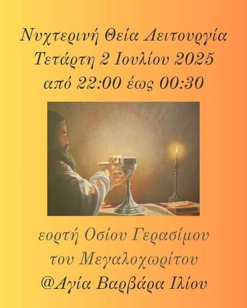 Νυχτερινή Θεία Λειτουργία με Όρθρο θα τελεστεί στον Ιερό Ναό Αγίας Βαρβάρας Ιλίου την Τετάρτη 2 Ιουλίου 2025, από 22:00 έως 00:30, επί τη εορτή του Οσίου Γερασίμου του Μεγαλοχωρίτου.