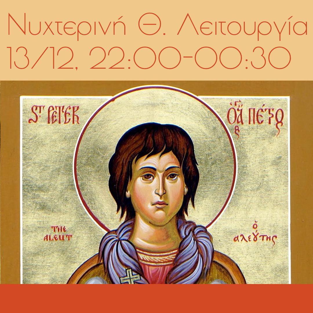 Νυχτερινή Θεία Λειτουργία θα τελεστεί στον Ιερό Ναό Αγίας Βαρβάρας Ιλίου επί τη μνήμη του Αγίου Πέτρου του Αλεουτίου, την Τετάρτη 13 Δεκεμβρίου 2023, από 22:00-00:30.