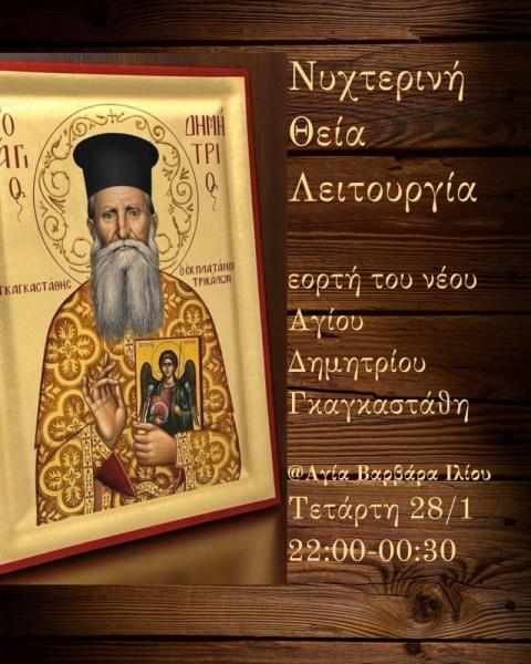 Νυχτερινή Θεία Λειτουργία με Όρθρο επί τη πρώτη εορτή του νέου Αγίου Δημητρίου Γκαγκαστάθη (αγιοκατατάχθηκε τον Ιούλιο 2025) θα τελεστεί στον Ιερό Ναό Αγίας Βαρβάρα Ιλίου, την Τετάρτη 28 Ιανουαρίου 2026, από 22:00 έως 00:30.