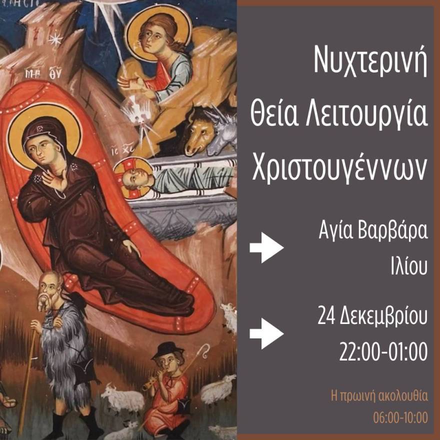 Νυχτερινή Θεία Λειτουργία Χριστουγέννων (με Όρθρο) θα τελεστεί στην ενορία της Αγίας Βαρβάρας Ιλίου, από 22:00 έως 01:00 περίπου. Η πρωινή ακολουθία από 06:00-10:00.