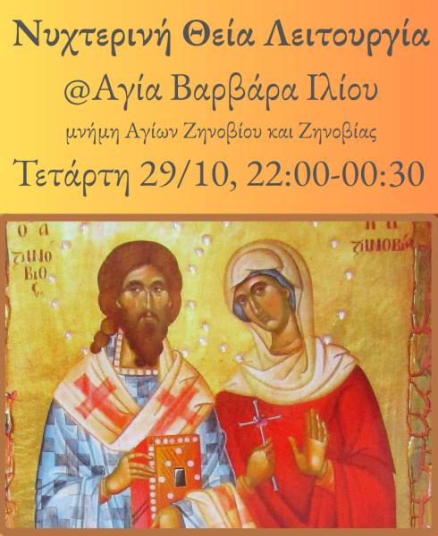 Νυχτερινή Θεία Λειτουργία θα τελεστεί στον Ιερό Ναό Αγίας Βαρβάρας Ιλίου, την Τετάρτη 29 Οκτωβρίου 2025, από 22:00-00:30, επί τη μνήμη των Αγίων Ζηνοβίου και Ζηνοβίας.