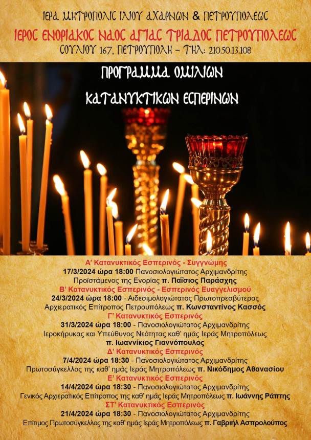 Κατά την περίοδο της Μεγάλης Τεσσαρακοστής θα πραγματοποιηθούν ομιλίες στον Ιερό Ναό Αγίας Τριάδος Πετρουπόλεως μετά την ακολουθία του Κατανυκτικού Εσπερινού, κατά το ακόλουθο πρόγραμμα: