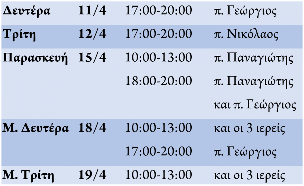 Το μυστήριο της μετανοίας και εξομολογήσεως στην ενορία της Αγίας Βαρβάρας Ιλίου θα τελεστεί κατά τις ανωτέρω ημέρες και ώρες. Παρακαλούμε τους πιστούς, λόγω πλήθους προσερχομένων, να είναι ακόμη περισσότερο ακριβείς και σύντομοι.