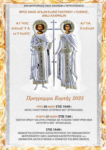Ο Ιερός Ναός Αγίων Κωνσταντίνου και Ελένης Άνω Αχαρνών πανηγυρίζει την εορτή των αγίων προστατών της ενορίας σύμφωνα με το ακόλουθο πρόγραμμα:
