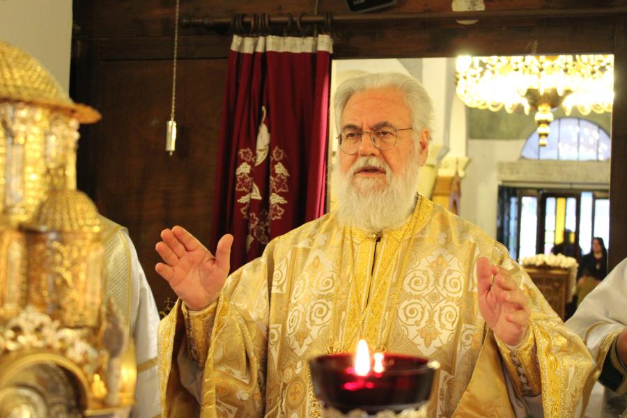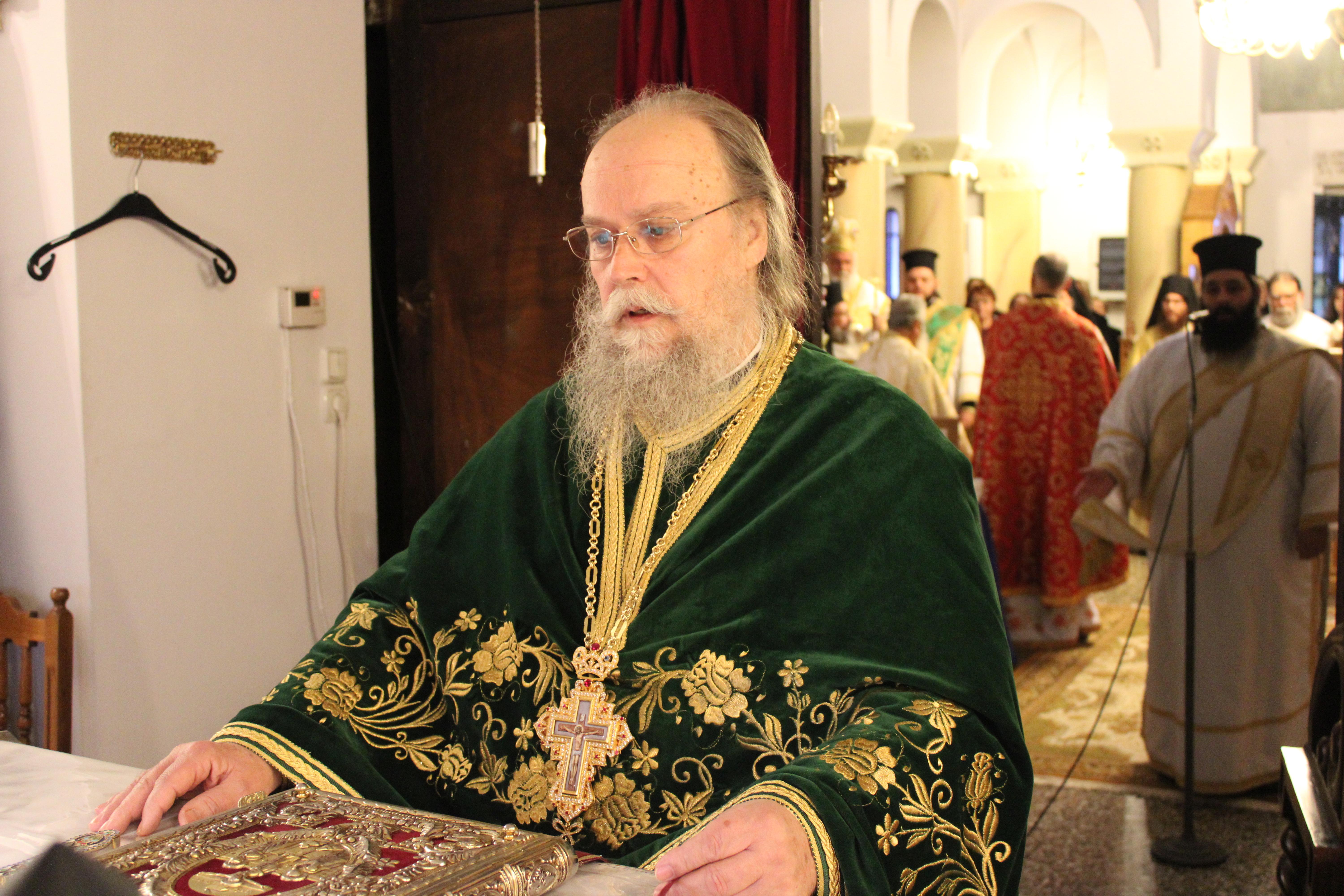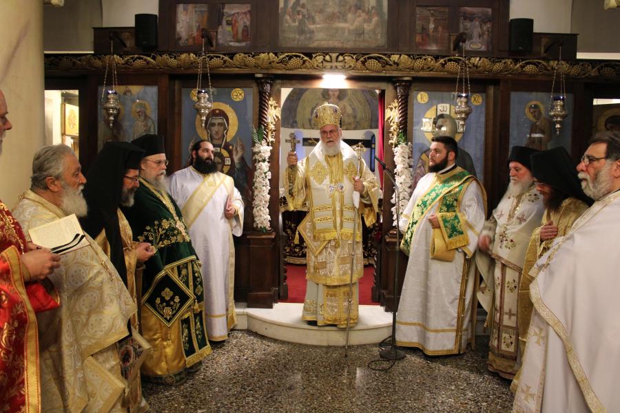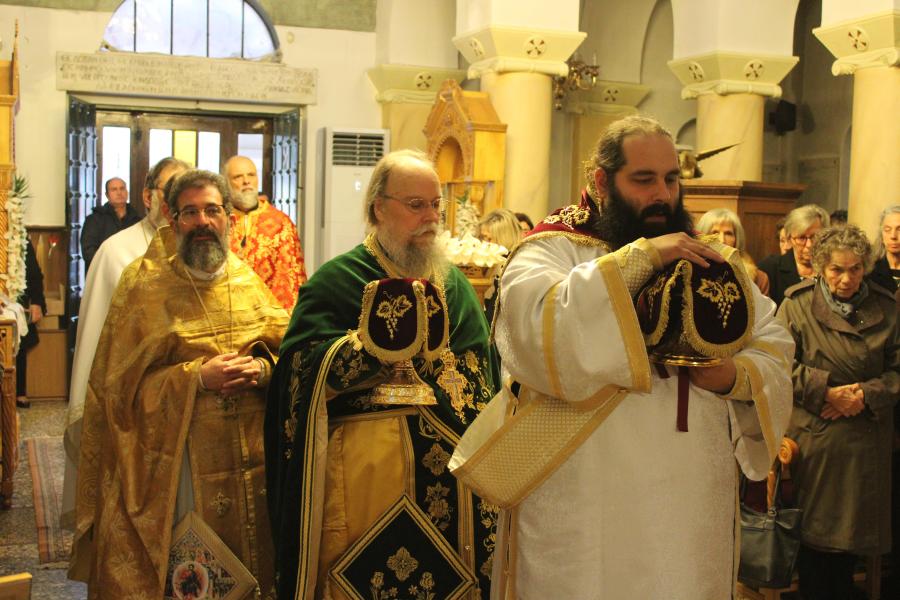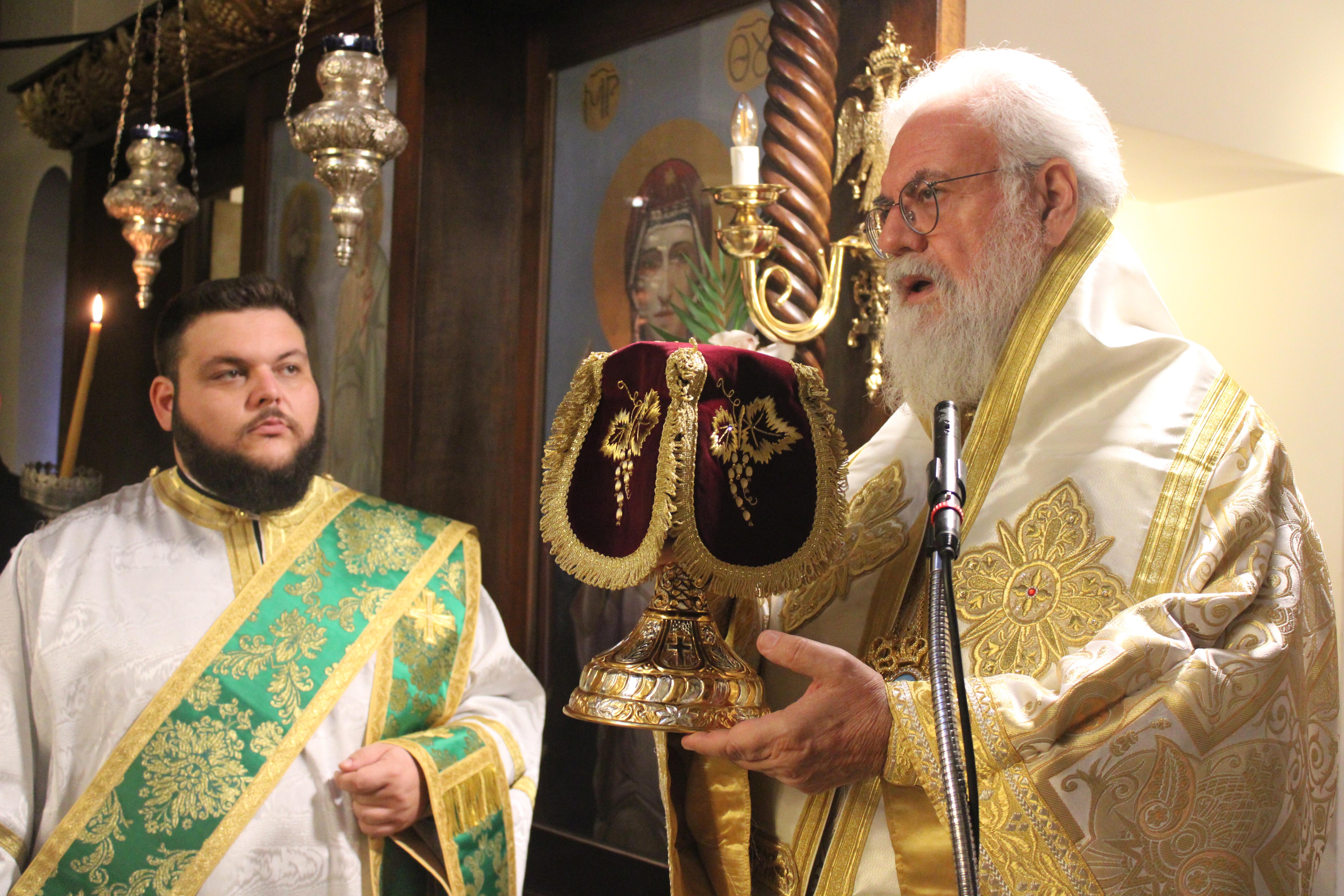 συμπαραστατούμενος από τους Αρχιμανδρίτες Ιωάννη Ράπτη - Γενικό Αρχιερατικό Επίτροπο της Ιεράς Μητροπόλεως, Αγαθάγγελο Κόκλα - Ιεροκήρυκα, Ειρηναίο Μπουσδέκη - ηγούμενο της Ιεράς Μονής Νέου Στουδίου στον Αυλώνα, ο οποίος στο «κοινωνικό» ομίλησε κατάλληλα για το βίο και τους ασκητικούς αγώνες του οσίου, οι οποίοι μπορούν να αποτελέσουν παράδειγμα στην ταραγμένη από τα πάθη και  τους πολέμους εποχή μας, τους πατέρες Δοσίθεο ιερομόναχο στην ίδια Μονή, Νικόλαο Κουτούζο - εφημέριο του Ιερού Ναού της Αγίας Βαρβάρας Ιλίου, Ιωάννη Οικονομίδη - Πρόεδρο του Εκκλ. Συμβουλίου του εορτάζοντος Ιερού Ναού, Παναγιώτη Αλεξανδρόπουλο - συνταξιούχο εφημέριο του Ιερού Ναού και τους διακόνους του π. Άγγελο Μιχαλόπουλο και π. Καλλίνικο Ζωγράφο.