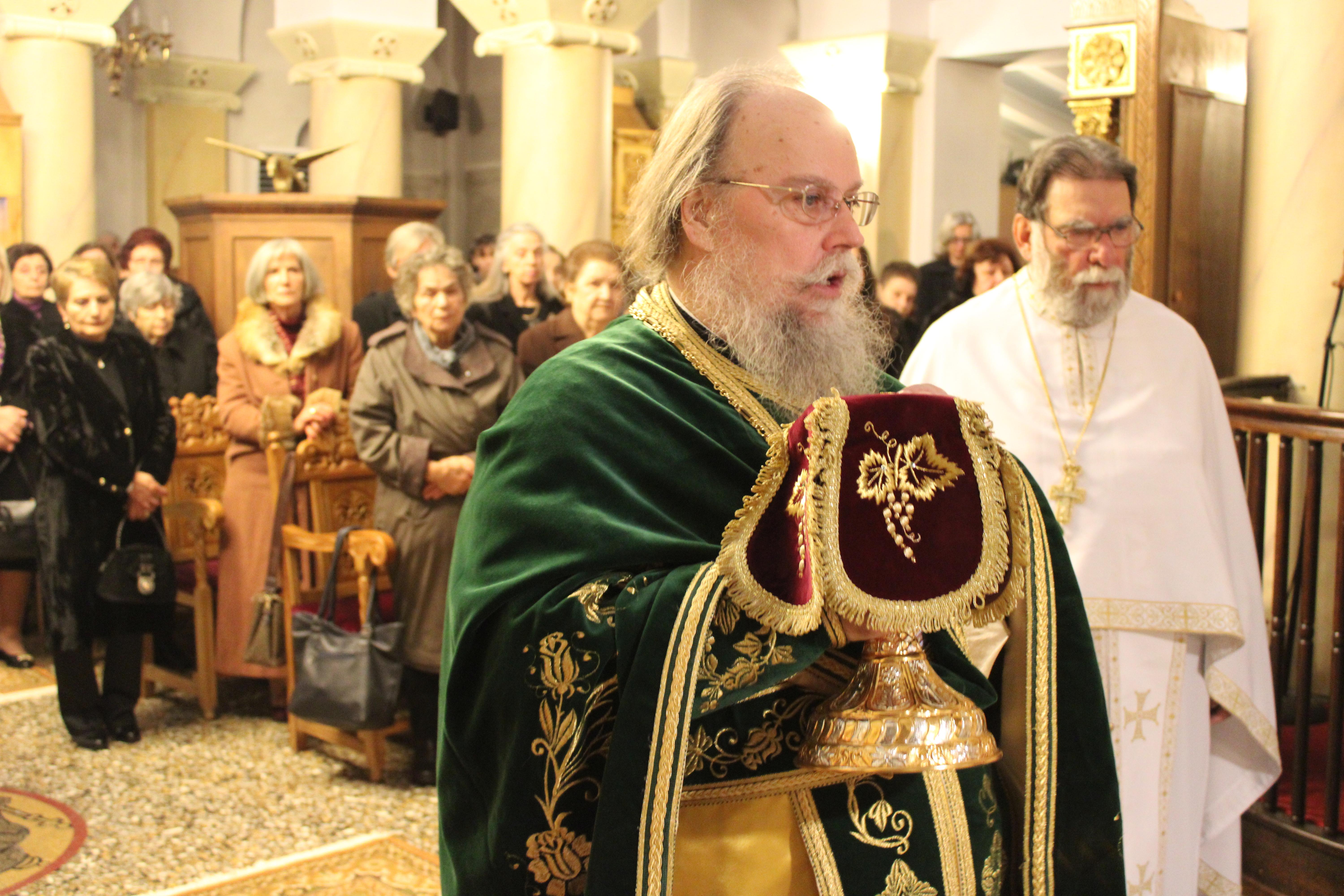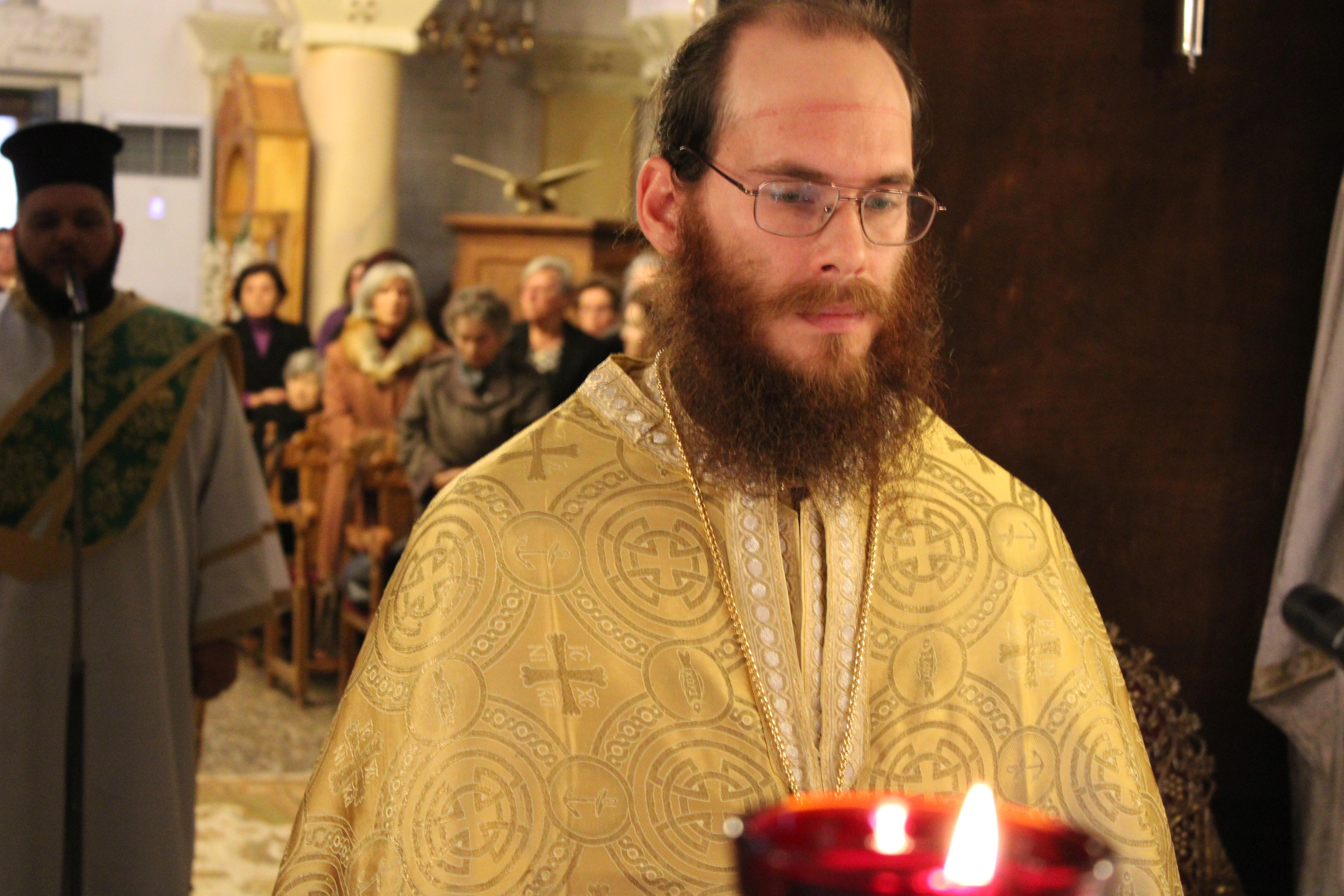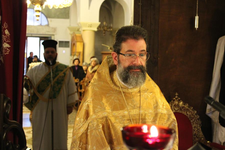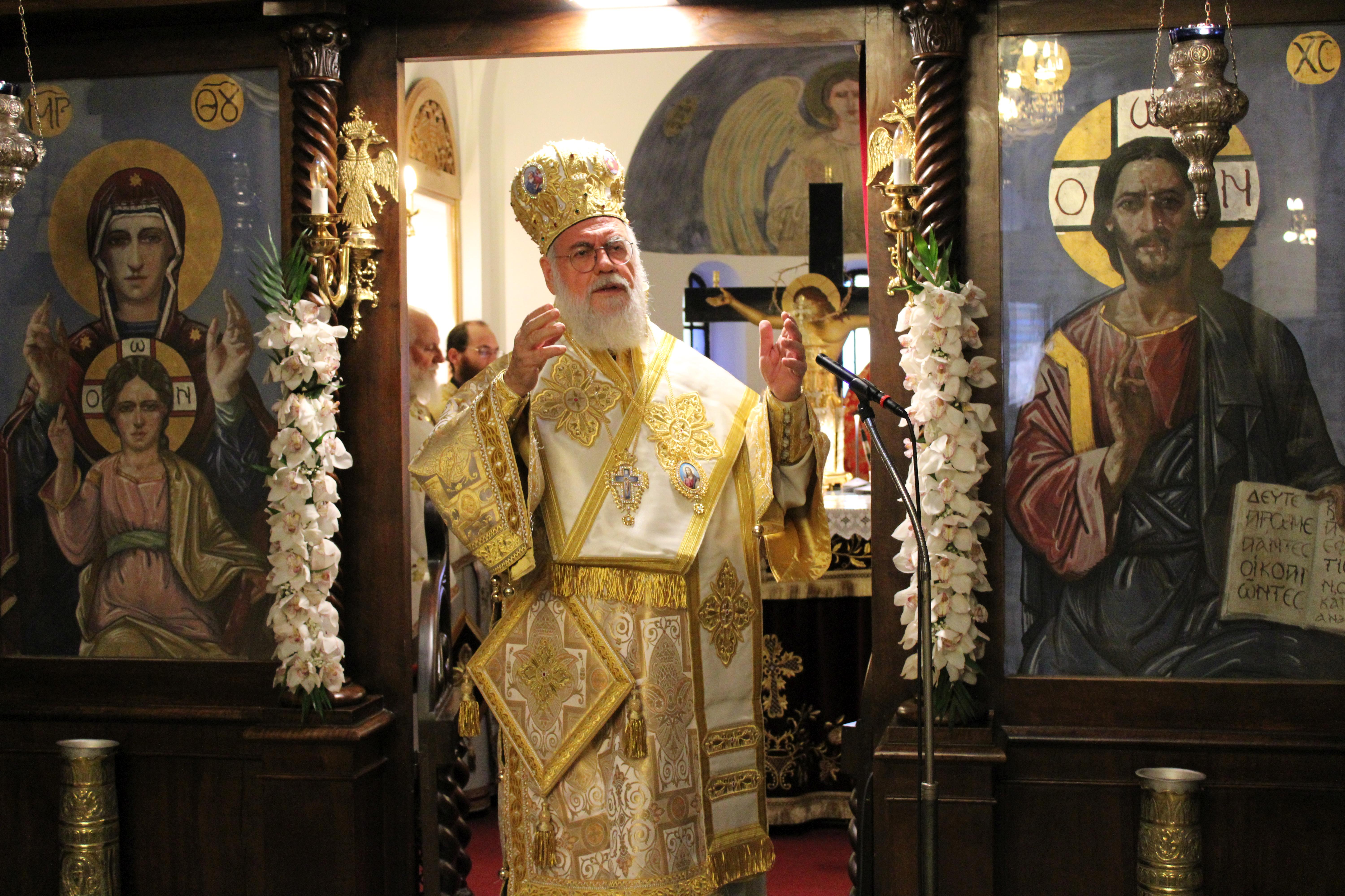 συμπαραστατούμενος από τους Αρχιμανδρίτες Ιωάννη Ράπτη - Γενικό Αρχιερατικό Επίτροπο της Ιεράς Μητροπόλεως, Αγαθάγγελο Κόκλα - Ιεροκήρυκα, Ειρηναίο Μπουσδέκη - ηγούμενο της Ιεράς Μονής Νέου Στουδίου στον Αυλώνα, ο οποίος στο «κοινωνικό» ομίλησε κατάλληλα για το βίο και τους ασκητικούς αγώνες του οσίου, οι οποίοι μπορούν να αποτελέσουν παράδειγμα στην ταραγμένη από τα πάθη και  τους πολέμους εποχή μας, τους πατέρες Δοσίθεο ιερομόναχο στην ίδια Μονή, Νικόλαο Κουτούζο - εφημέριο του Ιερού Ναού της Αγίας Βαρβάρας Ιλίου, Ιωάννη Οικονομίδη - Πρόεδρο του Εκκλ. Συμβουλίου του εορτάζοντος Ιερού Ναού, Παναγιώτη Αλεξανδρόπουλο - συνταξιούχο εφημέριο του Ιερού Ναού και τους διακόνους του π. Άγγελο Μιχαλόπουλο και π. Καλλίνικο Ζωγράφο.