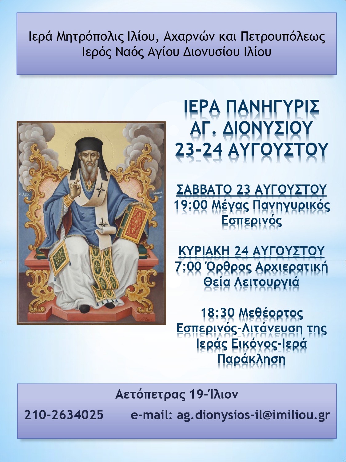 Δείτε το πρόγραμμα πανηγύρεως του Ι.Ν. Αγίου Διονυσίου Ιλίου.