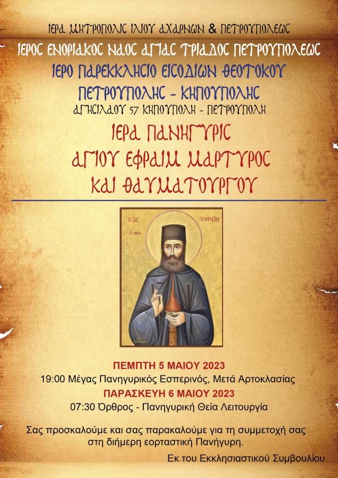 Ιερά Πανήγυρις του Αγίου Εφραίμ του μάρτυρος και θαυματουργού θα τελεστεί στο Ιερό Παρεκκλήσιο των Εισοδίων της Θεοτόκου, στον Ιερό Ναό Αγίας Τριάδος Πετρουπόλεως, στις 5 και 6 Μαΐου 2023.