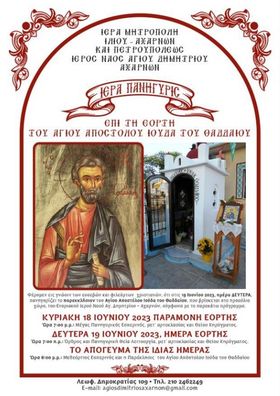 Φέρομεν εις γνώσιν των ευσεβών και φιλεόρτων χριστιανών, ότι στις 19 Ιουνίου 2023, ημέρα Δευτέρα, πανηγυρίζει το παρεκκλήσιον του Αγίου Αποστόλου Ιούδα του Θαδδαίου, που βρίσκεται στον προαύλιο χώρο, του ενοριακού Ιερού Ναού Αγίου Δημητρίου Αχαρνών, σύμφωνα με το παρακάτω πρόγραμμα.