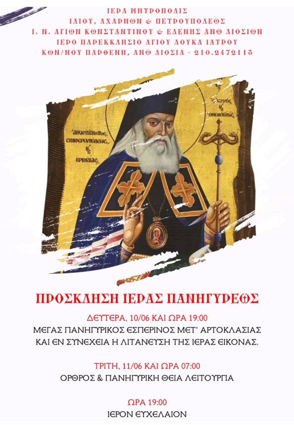 Πανηγυρίζει το ιερό παρεκκλήσιο του Αγίου Λουκά του ιατρού, Αρχιεπισκόπου Συμφερουπόλεως, το οποίο βρίσκεται στην ενορία των Αγίων Κωνσταντίνου και Ελένης Άνω Λιοσίων, στην οδό Κ. Παρθένη.