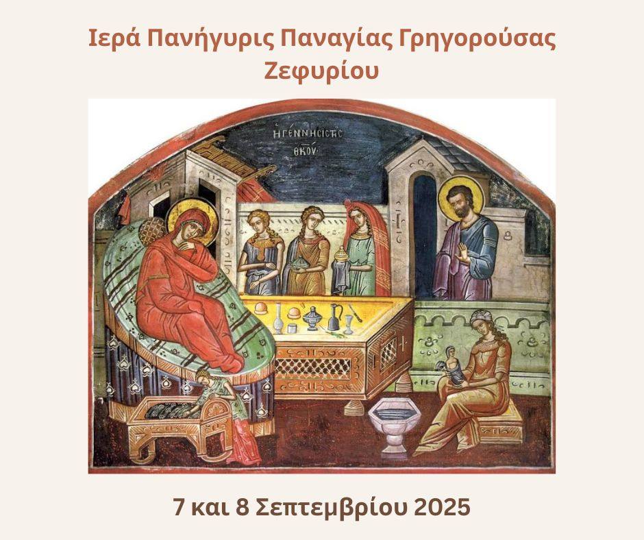 Ο Ιερός Ναός Παναγίας Γρηγορούσας Ζεφυρίου πανηγυρίζει την εορτή του Γενεθλίου της Υπεραγίας Θεοτόκου, σύμφωνα με το ακόλουθο πρόγραμμα.