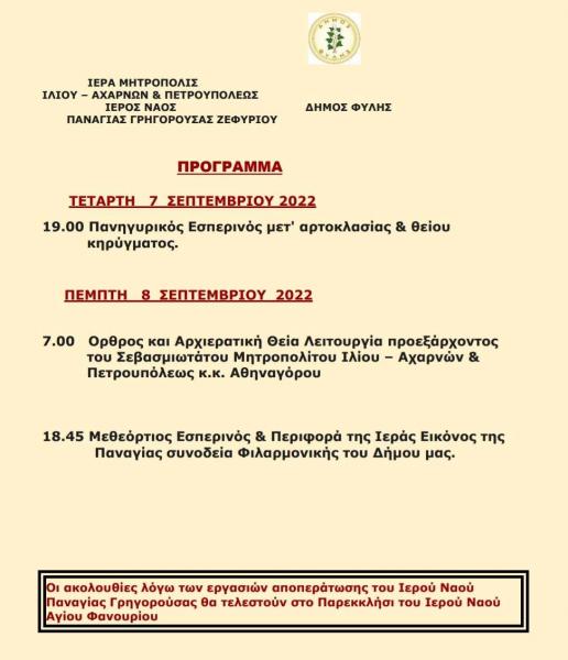 Πανηγυρίζει η ενορία της Παναγίας Γρηγορούσας Ζεφυρίου το Γενέθλιο της Θεοτόκου, στις 8 Σεπτεμβρίου.