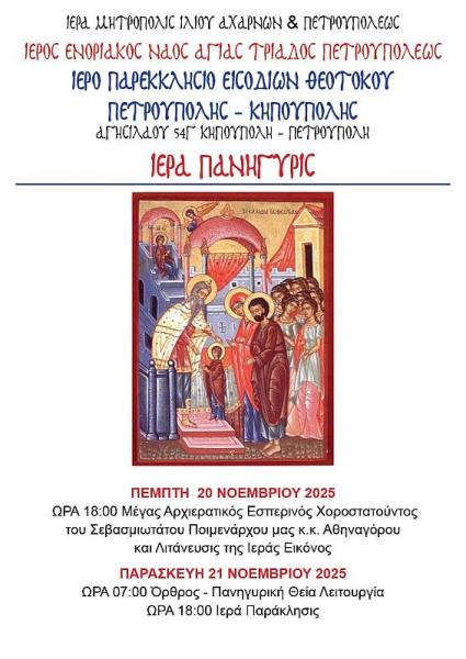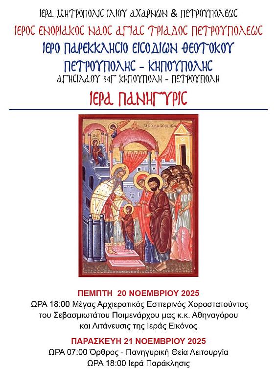 Πανηγυρίζει το Ιερό Παρεκκλήσιο των Εισοδίων της Θεοτόκου Πετρούπολης-Κηπούπολης στις 20 και 21 Νοεμβρίου 2025, σύμφωνα με το ακόλουθο πρόγραμμα: